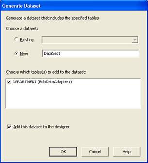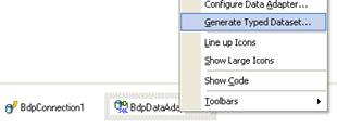 Inicie uma nova aplicação do tipo Windows Forms Application . Expanda a conexão Employee no Data Explorer e arraste a tabelas Department para o designer. Isso cria um BdpConnection e um BdpDataAdapter . Dê um clique de direita sobre o BdpDataAdapter e escolha a opção Generate Typed DataSet :