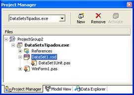 Observe que ao projeto são adicionados dois novos arquivos, um arquivo XSD, que é o XML schema representando o DataSet e uma unit, chamada DataSet1Unit , que abriga a classe criada para o DataSet tipado: