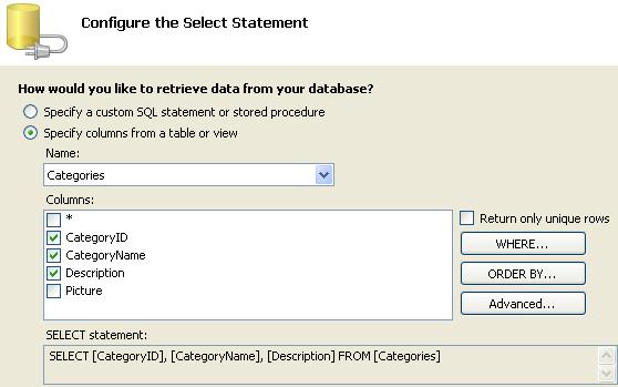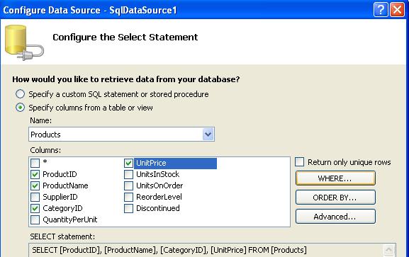Na janela que pede para você configurar a instrução de Select, escolha a tabela Products e as colunas ProductID, ProductName, CategoryID e UnitPrice, como a imagem abaixo nos mostra: