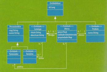 Vamos começar definindo os elementos principais do negocio. O diagrama de classes inicial é mostrado na Figura 1 (com getters e setters omitidos): nele são representados as entidades, sobre as quais serão realizadas as principais operações do sistema. As classes Produto, Oferta, Catálogo, Fornecedor e Varejista surgem diretamente de uma análise do cenário proposto; as classes abstratas EntidadeBase e PessoaJuridica visam apenas à reutilização de códigos.