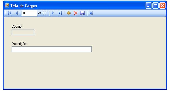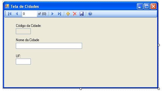 Assim será gerado automaticamente no form um DataSet e um BindingSource. Será necessário também inserir um BindingNavigator, que será responsável por inserir, excluir e navegar nos dados. Ao inserir o BindingNavigator é necessário informar qual o BindingSource que este utilizará, que por sinal é o que foi criado automaticamente.