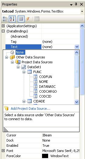 Para os campos TextBox para setar a propriedade de DataBinding é necessário informarmos qual DataSource e qual campo que este estará ligado, conforme Figura 8.