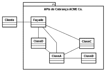 Imagine o cenário: na empresa Acme Co. há uma plataforma complexa de APIs de cobrança, mas clientes externos precisam utilizar apenas parte dos seus recursos. Em vez de conhecer toda a complexidade da API de cobrança, seria adequado que os desenvolvedores disponibilizassem uma interface simples o suficiente para chamar os métodos que realizam as tarefas necessárias. A idéia é criar uma “fachada” que esconda toda a complexidade interna das APIs de cobrança. Dessa forma, os clientes da API de cobrança da Acme Co. ficarão agradecidos. A Figura 1 ilustra a solução do problema.