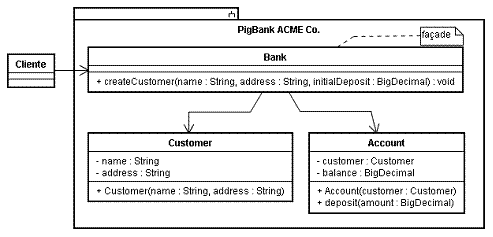O subsistema bancário responsável pela abertura de contas possui classes diferentes para representar o cliente (Customer) e a conta (Account). Assim, para criar uma conta com um depósito inicial, seriam necessárias duas chamadas, uma para criar a conta e outra para efetuar o depósito inicial. Para simplificar o uso do subsistema, um façade foi criado (Bank) para realizar as duas operações em uma única chamada de método (createCustomer(...)). Na Listagem 1, a implementação da solução.