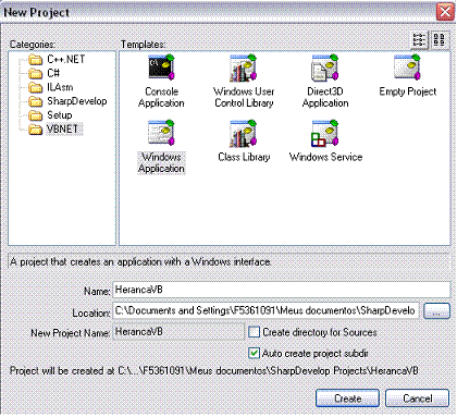 Vamos então ver na prática como funciona e como podemos usar herança no VB.NET. Eu vou usar SharpDevelop que teve sua versão 1.02 disponibilizada recentemente para criar as classes e o todo o código visto neste artigo. Só para lembrar, o SharpDevelop é uma ferramenta open-source (GPL) que você pode obter em: http://www.sharpdevelop.com/OpenSource/SD/Default.aspx