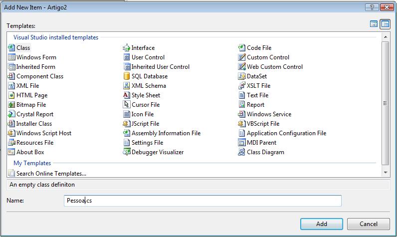 Nós já temos a base de uma classe. Para implementar herança, vamos adicionar uma nova classe, usando Menu Projct > Add Class. Renomeie como Funcionario.cs e digite o seguinte código: