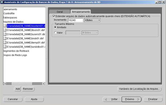 A Tablespace SYSTEM é obrigatória, pois nela está contido o dicionário de dados do BD, necessário para sua inicialização. O restante é configurado de acordo com a necessidade, criando-se Tablespace para dados dos usuários e outra exclusiva para índices, por exemplo. O DBCA já define algumas Tablespaces automaticamente, cabe a nós aceitar as sugestões ou, remover ou adicionar (botão “Add”) configurando alguns dos parâmetros do arquivo de dados (Figura 13).