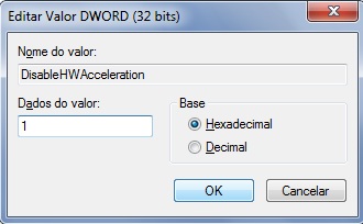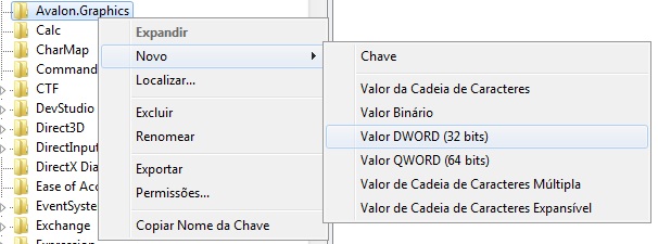 Na chave criada, dei a ela o nome Avalon.Graphics. No meu caso tive que cria-la mais podem ter casos em que ela já exista. Pra todos os casos, dentro desta chave temos que criar uma chave DWord, chamada DisableHWAcceleration, como a Figura 03 ilustra.