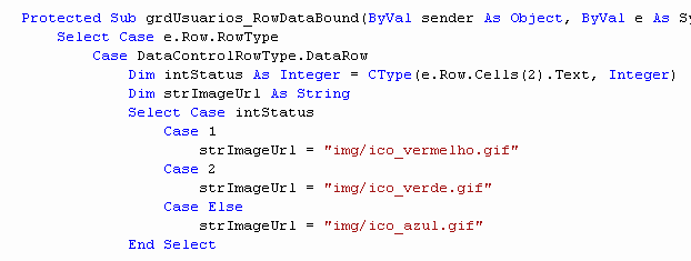 Como no nosso caso vamos apenas manipular as linhas com os resultados, vamos usar o “DataControlRowType.DataRow” Caso seja esse o tipo da linha, vamos dizer para ele qual imagem utilizar no nosso controle imgIconeStatus. O Parametro que usaremos para saber qual imagem exibir esta dentro da coluna status. Para resgatar esse valor vamos usar uma variável do tipo Integer.