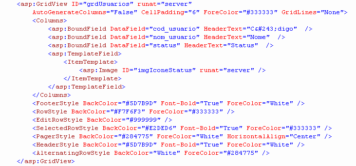 Como vocês podem perceber a única alteração realizada no GridView, foi a inserção de uma nova Coluna do Tipo TemplateField, Dentro dessa Coluna informamos qual o template a seguir dentro da Tag ItemTemplate.