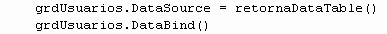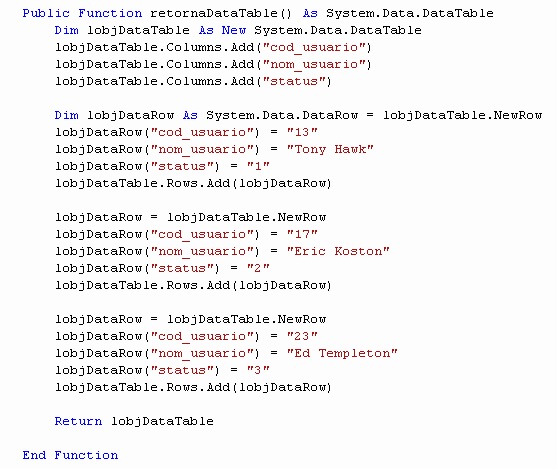 Para Facilitar o entendimento do artigo eu usei uma Função que Retorna um DataTable estático com 3 registros apenas, mas isso fica a critério de vocês. Para quem quiser fazer exatamente igual ao meu exemplo, segue o código do DataTable abaixo: