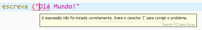 escreva ("Olá Mundo!")Se utilizarmos a sintaxe incorreta no Portugol Studio, ele sempre nos indicará onde erramos, como vemos na Figura 1.