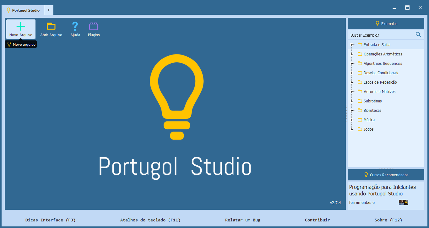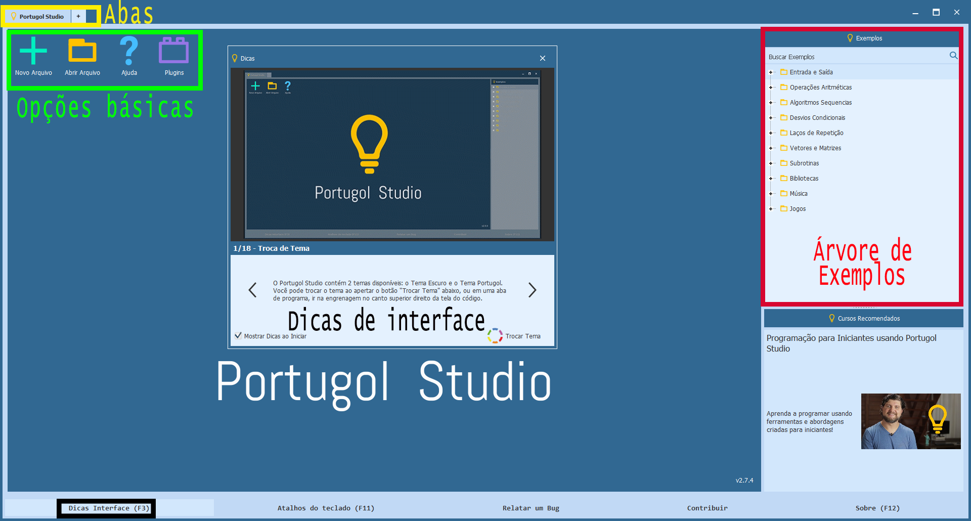 - Dicas de Interface: o próprio Portugol Studio oferece um tutorial explicando suas particularidades. São 18 partes que vão desde a escolha do tema até a explicação de seus menus e solução de bugs.