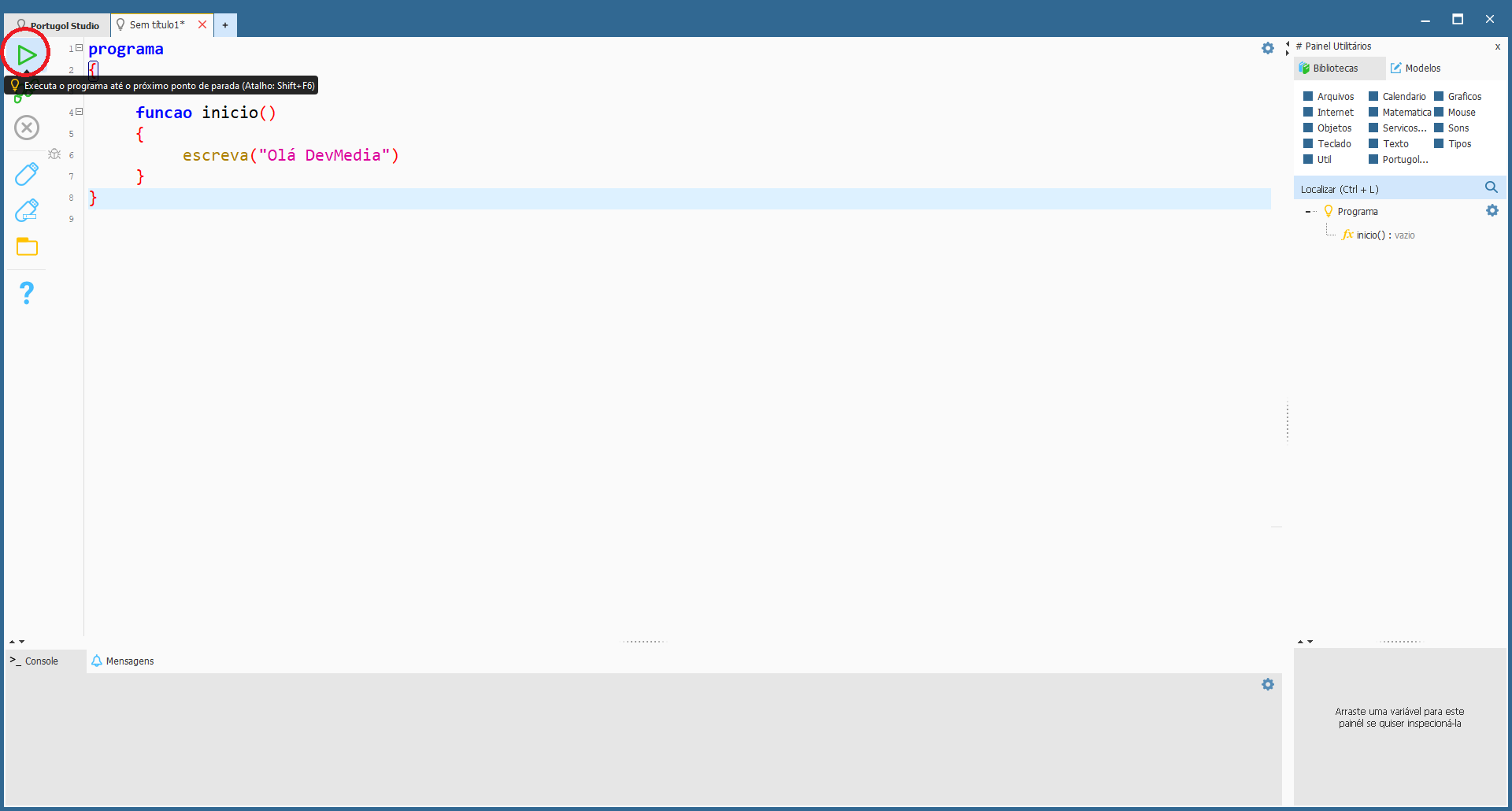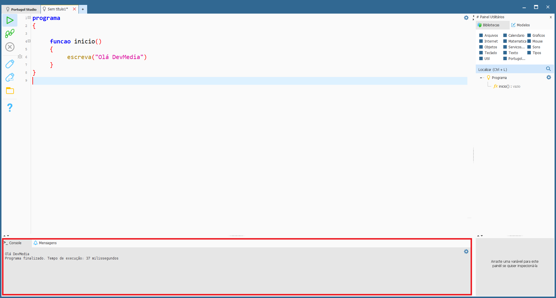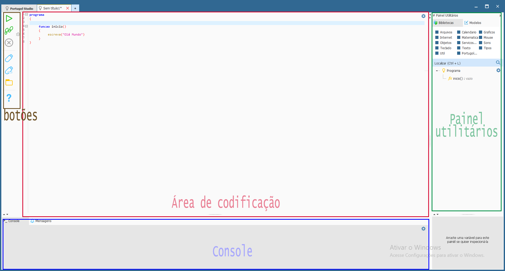 Repare que a tela do Portugol Studio mudou um pouco em relação ao que vimos na Figura 3. Agora contamos com a seguinte estrutura: