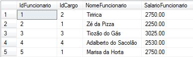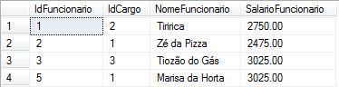 Perceba que foram atualizados os salários apenas dos funcionários Zé da Pizza e Marisa da Horta, que contém o Id 1, referente ao cargo Programador Jr.