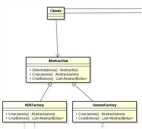 A ideia é que a aplicação não chame diretamente as classes concretas e que a adição ou remoção de um tipo de interface dê o menor trabalho possível, portanto vamos criar uma classe abstrata para que a classe cliente que necessitar de uma janela, por exemplo, não saiba se a janela é de “KDE” ou “Gnome”, ela tem de saber apenas que é uma janela.