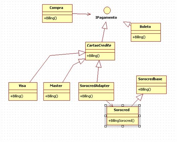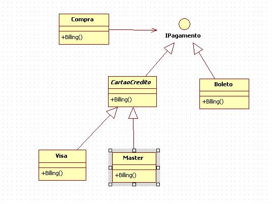 Visa e master são as implementações reais que utilizávamos, até então, para fazer o Billing dependendo do cartão que o cliente utilizava, e a propósito, elas herdam de CartaodeCredito. Segue o diagrama: