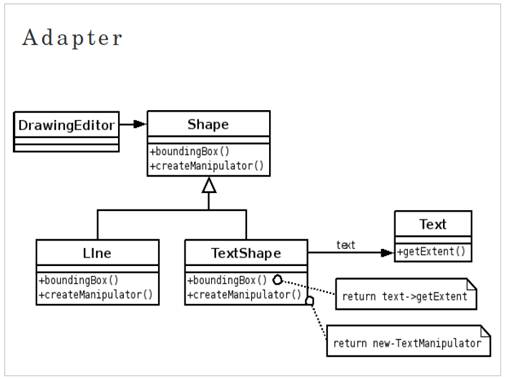 Em sua definição o padrão Adapter possui a tarefa de converter a interface de uma classe para outra interface que uma classe cliente espera, permitindo que classes trabalhem juntas, mesmo possuindo interfaces diferentes. O próprio Delphi aplica automaticamente o padrão Adapter para nós. Em outras palavras algumas vezes, uma classe projetada para ser reusada não o é porque sua interface não combina com a interface requisitada por uma aplicação de um domínio específico, um exemplo disso: uma classe TextView existente poderia ser reusada através de uma interface TextShape em um editor de desenhos para desenhar e organizar elementos gráficos (linhas, polígonos, etc.), tratando o texto como mais um tipo de elemento gráfico (Figura 1).