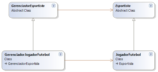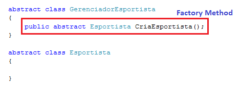 Com isso, você define a classe base que contém o factory method, as subclasses irão herdar dela, e terão a responsabilidade de decisão, sobre qual produto concreto irão instânciar; reduzindo o acoplamento e o custo de manutenção no software. No caso do exemplo, se o esportista mudar, basta apenas criar uma subclasse que crie este tipo concreto, mais a base se mantém a mesma. Veja abaixo a definição formal do padrão: