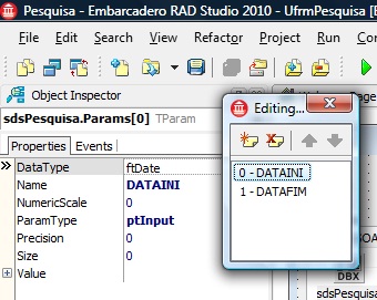 Obs.: Precisamos conferir sempre se o delphi definiu os parâmetros, caso o nome do parâmetro seja diferente do campo ele costuma não defini-lo para isso com o compoenente SqlDataSet selecionado dê dois clique na reticência em frente a propriedade Params e abrirá a uma tela, preencha de acordo com a tela a seguir: