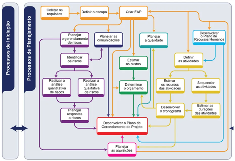 Os processos do grupo de planejamento envolvem as atividades: coletar requisito, definir o escopo, criar a Estrutura Analítica do Projeto (EAP), desenvolver o cronograma, estimar custos, planejar o gerenciamento dos riscos, planejar a qualidade, desenvolver o plano de recursos humanos, planejar as comunicações e planejar as aquisições. Na Figura 1, tem-se os grupos de processo do planejamento.
