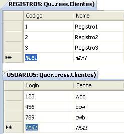 Prática – Feito uma breve explicação do SQL Injection, vamos a um exemplo prático. Crie uma aplicação em ASP.NET com o nome ExemploSQLInjection. Neste exemplo, irei utilizar o banco Clientes, onde tenho as tabelas Registros e Usuarios: