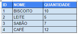 - SELECT ID, NOME, QUANTIDADE seleciona as colunas da tabela para serem exibidas na consulta, nesse caso ID, NOME e QUANTIDADE.