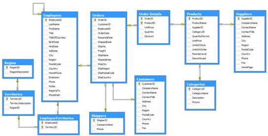 Vamos pegar como exemplo o database Northwind do SQL Server (veja na nota como e onde encontrá-lo). Imagine uma aplicação que vá utilizar as tabelas que você vê no diagrama de entidades e relacionamentos da Figura 1.