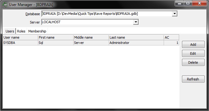 Abrindo o IBExpert acessando o Menu Tools / User Manager, veremos a seguinte janela. Esta tem a finalidade de administrar os usuários e senhas do seu Banco de Dados.