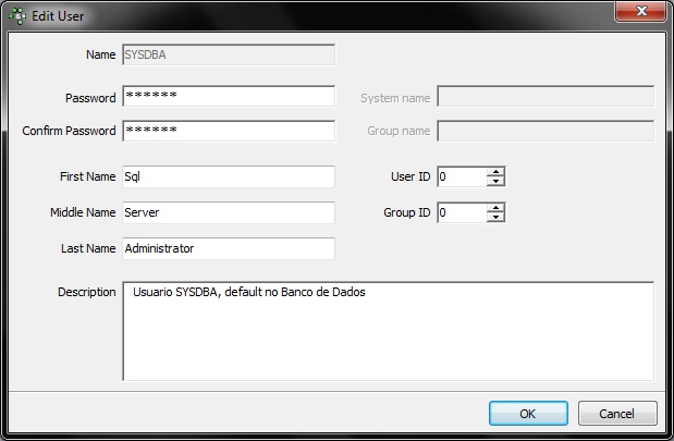Podemos notar que existe um usuário já criado, o default SYSDBA, para mudarmos sua senha clique no botão Edit