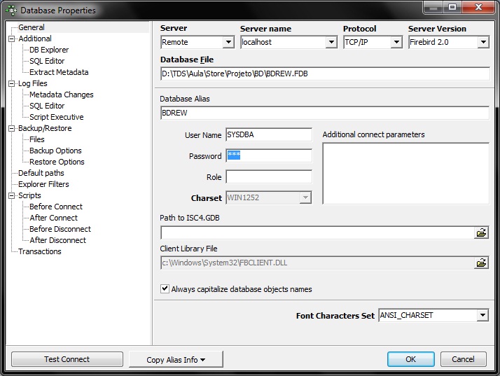 Em seguida iremos ver a seguinte janela, e nesta sim colocamos a nova senha do SYSDBA. Teste a conexão e clique em OK, pronto sua senha não é mais a Default masterkey.