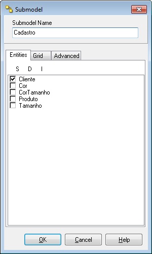 Caso você tenha mais entidades, vera que todas elas são listadas, para adicionar o novo SubModelo, basta selecionar as mesmas, e definir o nome, será criado um SubModelo. Veremos a janela abaixo :
