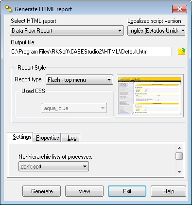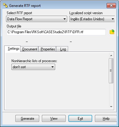 Podemos exportar o Modelo para os formatos HTML ou RTF, para efeito de documentação, através do Menu File / HTML Report ou File / RTF File.