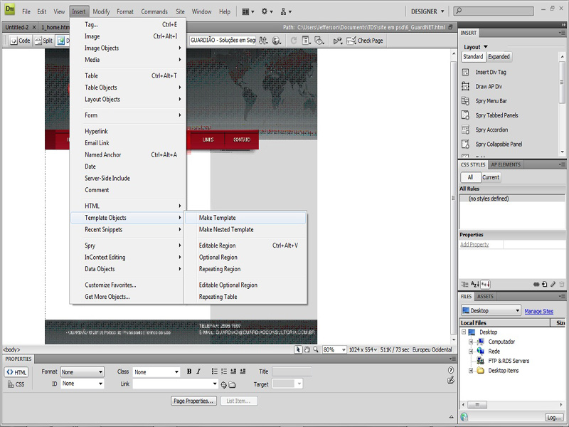 1- Crie a sua página principal com os elementos devidos, vá no menu INSERT --> TEMPLATE OBJECTS --> MAKE TEMPLATE