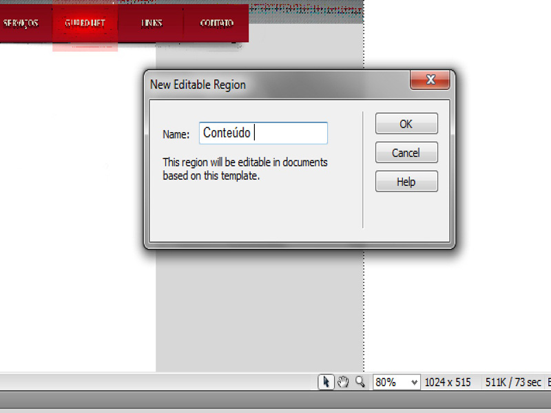 Para isso, vá, novamente, no menu INSERT -->TEMPLATE OBJECTS marcando agora a opção EDITABLE REGION . Você poderá definir então o nome da região e em seguida ela será exibida na tela.