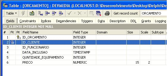O resultado final ficara assim, com o campo ID_CLIENTE na tabela de orçamento marcada por uma chave simbolizando um relacionamento com a tabela cliente: