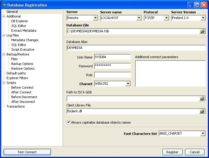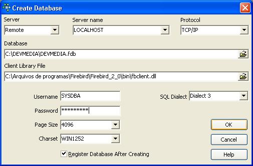 Configuraremos também o Page Size como 4096, ou seja, o nosso banco de dados terá 4 GB de espaço máximo como estipulado no início. O Charset será WIN1252 e manteremos o Sql Dialect como Dialect 3. Devemos manter a checkbox marcada para registrar banco após ser criado.