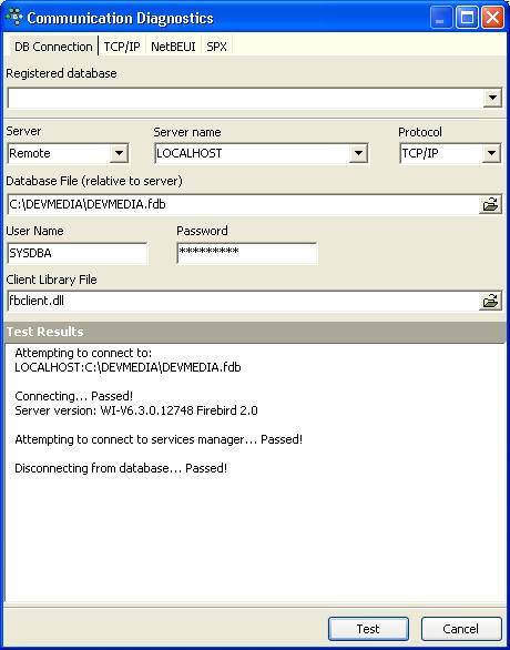 Repita o procedimento da Dll e em seguida clique no botão Test Connection.