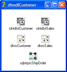 Em dtmdlCustomer, incluímos todos os componentes necessários para obter a funcionalidade associada aos Customers (Clientes). Qualquer regra de negócio anexada aos manipuladores de evento também será incorporada aqui. Observe que clntdtstSales foi incluído no dtmdlCustomer, isso porque o componente clntdtstSales esta apontando para o clntdtstCustomer em um relacionamento de vendas (sales) com clientes (customer).