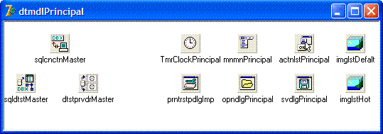 Pode-se observar que os únicos componentes colocados neste Data Module (dtmdlPrincipal) foram os de integração com o projeto em si: o TSQLConnection (sqlcnctnMaster), TSQLDataSet (sqldtstMaster), TDataSetProvider (dtstprvMaster) que fazem a integração com o banco de dados. Separando tais componentes dos DataSets - TClientDataSet, muitos dos problemas normalmente associados a herança do Data Module serão resolvidos.