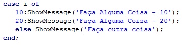 No exemplo acima, a mensagem “2” será exibida caso o valor de i seja 1 ou 2. Para termos o mesmo resultado no Delphi, teríamos que separar os possíveis valores por virgula, conforme mostrado abaixo.