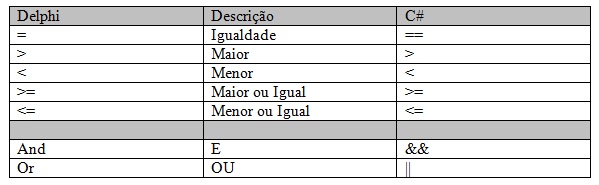 Antes de começarmos a falar das estruturas condicionais, vamos apresentar uma tabela com as diferenças dos operadores do Delphi e do C#.