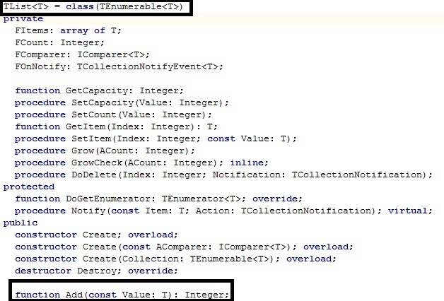 Observem na figura acima a declaração da classe TList. Vejam que no momento da declaração, é definido um tipo genérico T, agora observem o parâmetro do método Add, notem que este parâmetro é do tipo T. Com isso, o tipo deste parâmetro irá varia de acordo com o que nós colocarmos na declaração de nossa variável.