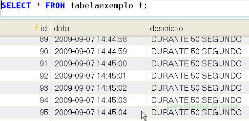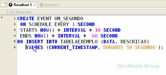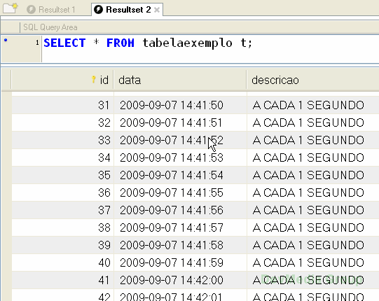 Observe que agora temos mais 2 linhas no comando CREATE EVENT, são elas STARTS e ENDS. Passamos para eles o data e hora que queremos iniciar a execução e a data e hora que queremos que a execução seja interrompida. Repare que expressões de data são suportadas conforme passamos acima. Observe o evento entrando em operação.