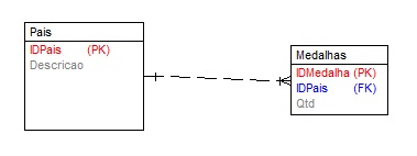 Vamos a construção do exemplo. Vou criar um cenário bem simples para ilustrar. Imagine as olimpíadas onde temos uma tabela com os países participantes, e temos o número de medalhas de cada um armazenados na tabela de Medalhas, observe o relacionamento :