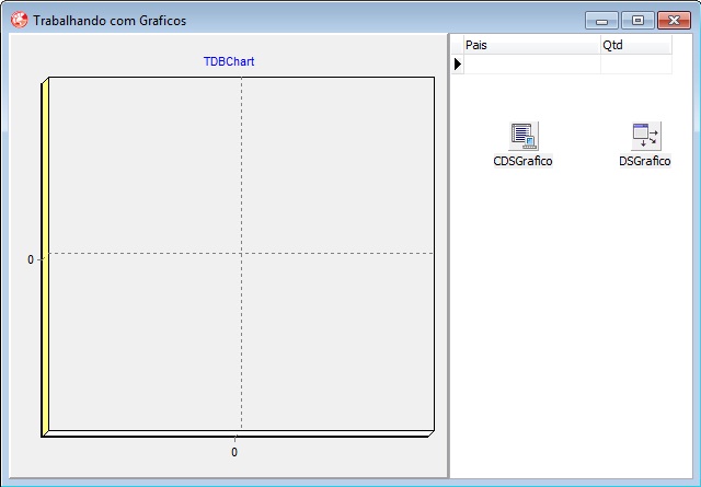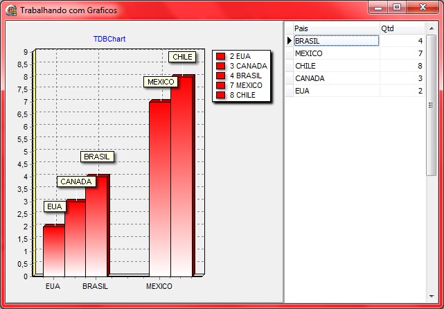 Onde temos o cadastro de países e ao lado tabela que representa o número de medalhas de cada um, alguns podem dizer que não tem necessidade já que a tabela de medalhas é apenas para guardar o Qtd, por que não botar na tabela de países, mas isso é apenas um exemplo, o correto seria ter um registro para cada medalha com a data, modalidade, hora, competidor, etc, e ao final fazer um SUM das medalhas de cada Pais, e ai sim mostrar o gráfico mas meu objetivo não é ensinar SQL, e sim DBChart.