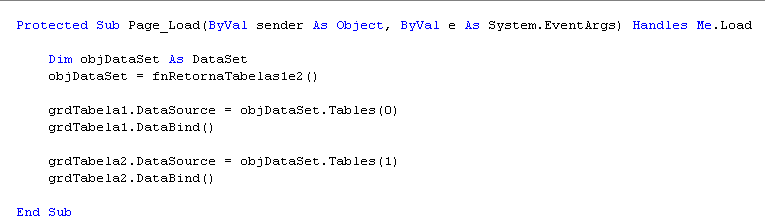 Agora vamos apontar o DataSource do grdTabela1 para o nosso objDataSet.Tables(0) e o DataSource do grdTabela2 para o nosso objDataSet.Tables(1). Executamos os dois DataBinds e pronto temos todas as informações que desejávamos.