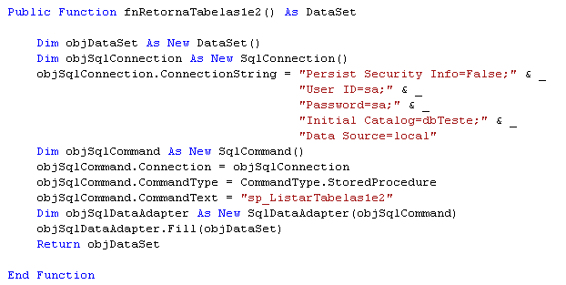 Agora vamos criar uma function que nos retornará um DataSet com as duas Tabelas Selecionadas na nossa procedure