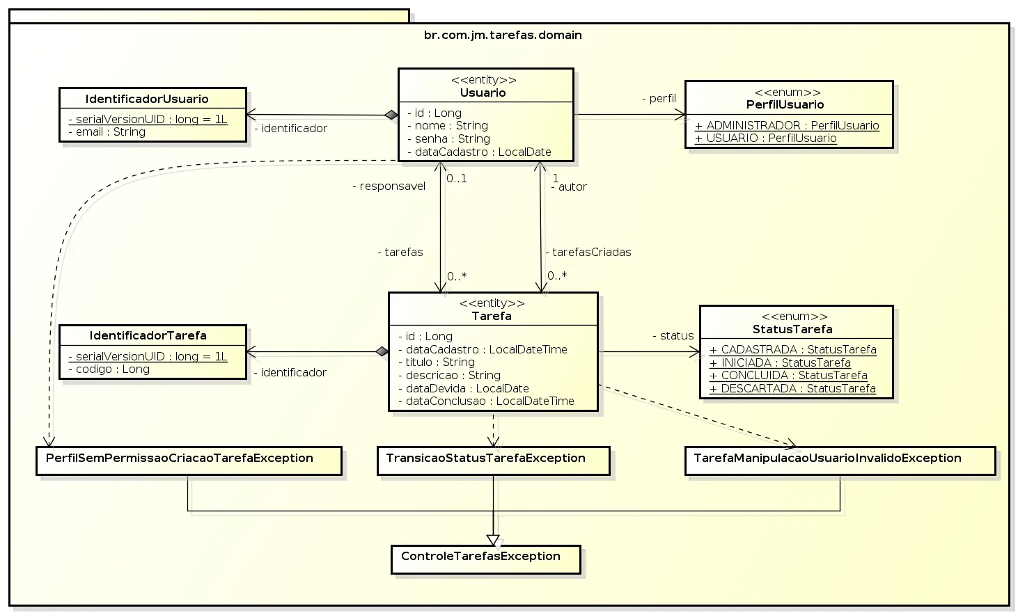 - br.com.jm.tarefas.domain.Tarefa: Classe que representa uma tarefa no sistema. Possui algumas informações pertinentes à tarefa e associação com identificador, autor e responsável;