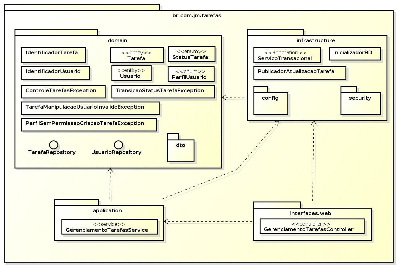 A classe GerenciamentoTarefasService, presente neste pacote, processa as requisições da camada de apresentação, recuperando as informações de usuário e tarefa envolvidas na solicitação - br.com.jm.tarefas.infrastrucuture: Pacote que armazena a camada com